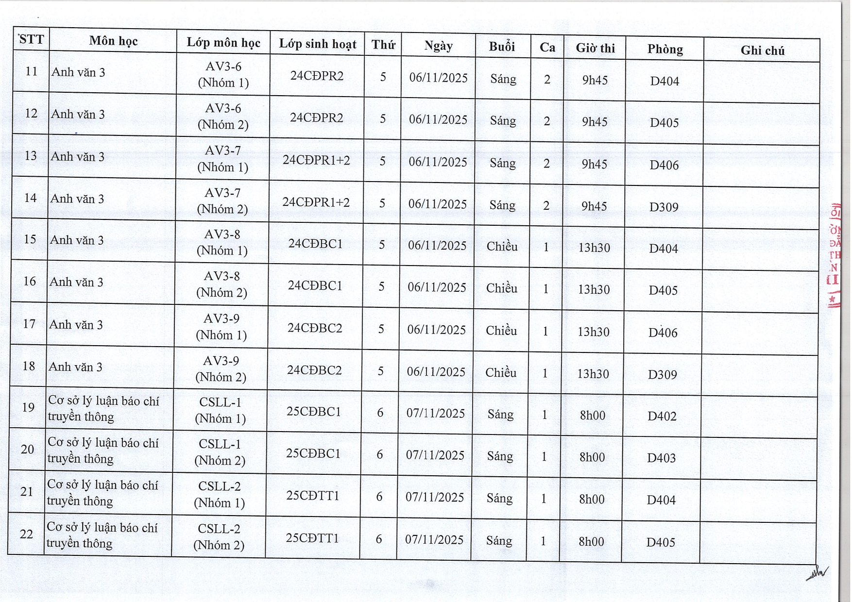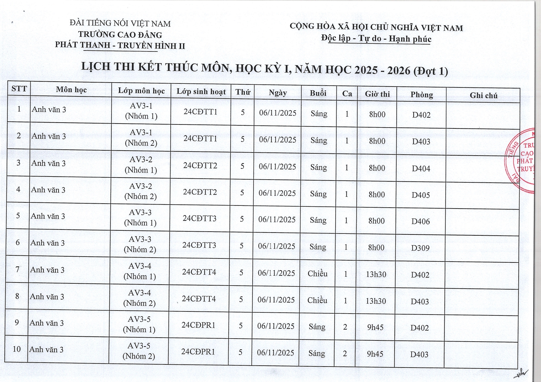 Lịch thi kết thúc môn học học kỳ I, năm học 2025-2026 (Đợt 1)