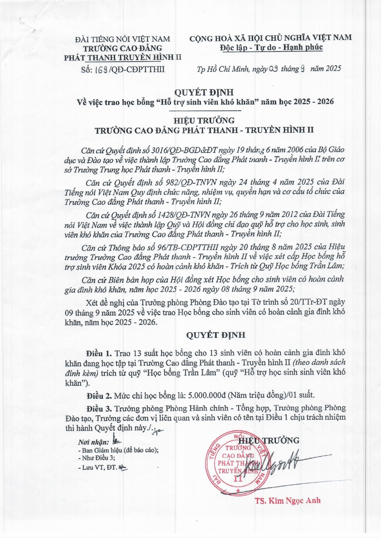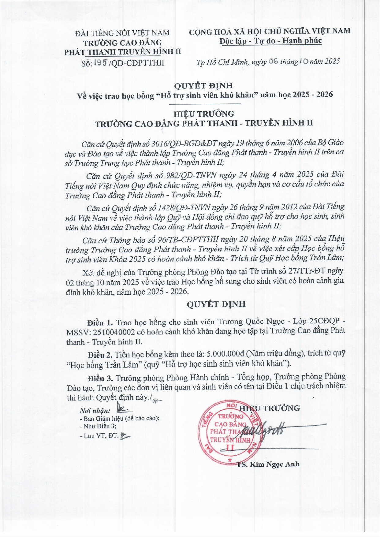 Quyết định về việc trao học bổng "Hỗ trợ sinh viên khó khăn" năm học 2025-2026